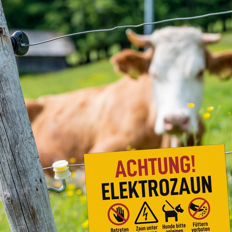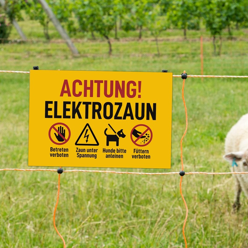 - With a thickness of 3 mm, our warning signs are a faithful companion on any pasture fence and ensure a permanent recognition of the lettering thanks to their matte surface. The coated signs are UV resistant and can withstand all weather conditions. The size 20 x 13 cm ensures ideal readability even from a greater distance. With this sign you meet the requirements of the standards VDE 0667, VDE 0131 and DIN EN 60335-2-76. Thanks to the high UV resistance and weather resistance, you no longer have to worry about the safety of your animals for a long time. Unlike other signs, our signs are very easy to install thanks to pre-drilled holes.