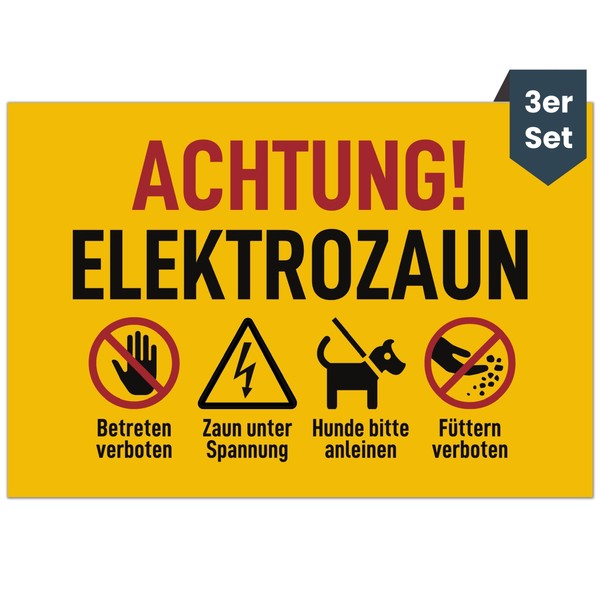 Caution Electric Fence Sign (20 x 13 cm - Set of 3) - Achtung Strom und Füttern verboten für jeden Weidezaun - kein Betreten für Stromzaun - Warnzeichen nach VDE 0667, VDE 0131 und DIN EN 60335-2-76