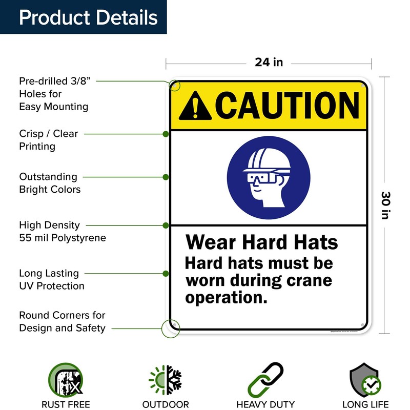Caution Wear Hard Hats During Operation Sign, 24x30 Inches, 55 mil thick HDPS (high density polystyrene), Made in USA by My Sign Center