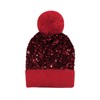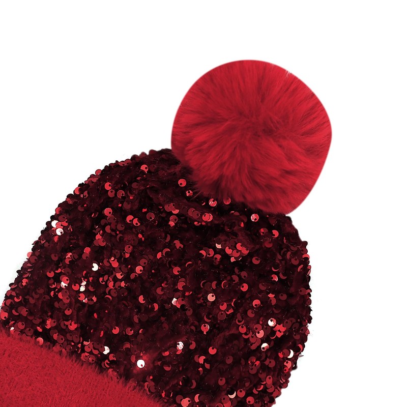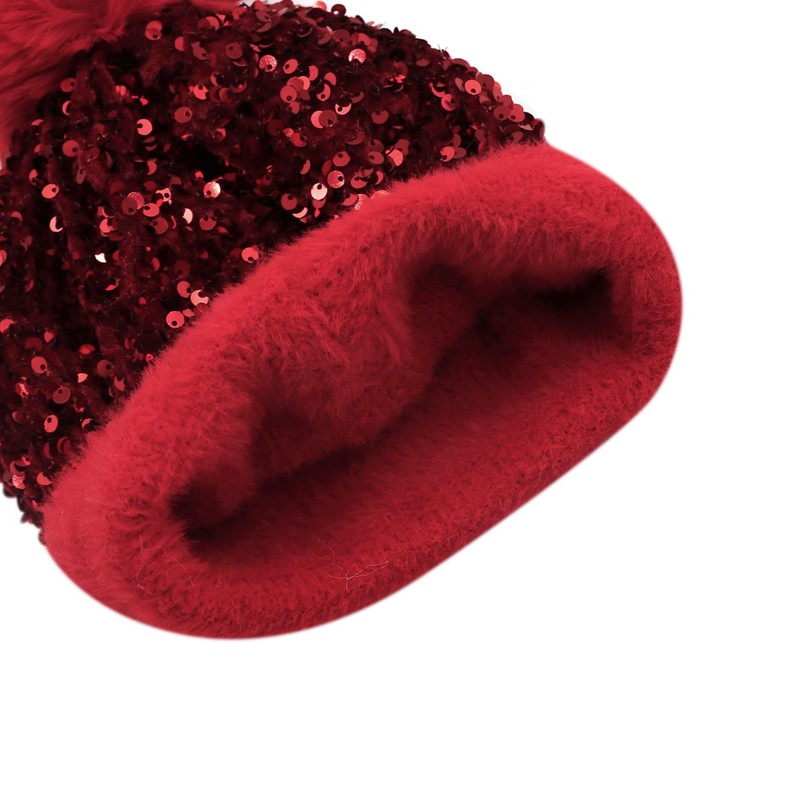 Caviotess Women Sparkly Sequins Knitted Beanie Hat Warm Winter Skull Cap with Faux Fur Pom Pom Red