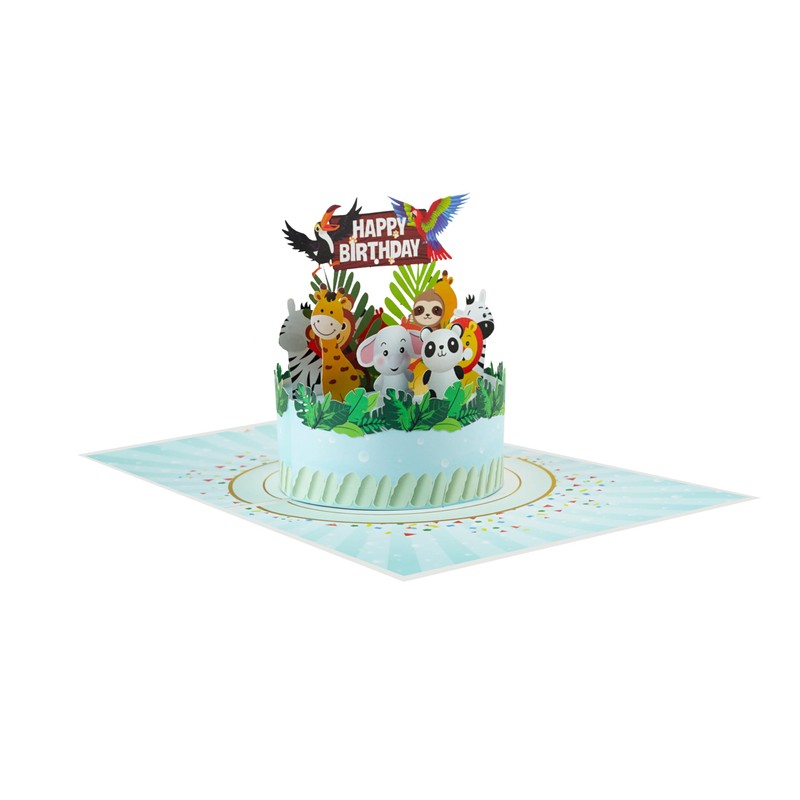 - 3D pop-up jungle animals: the card unfolds into a colourful 3D jungle with different animals such as lions, elephants and monkeys that provide animal pleasure.