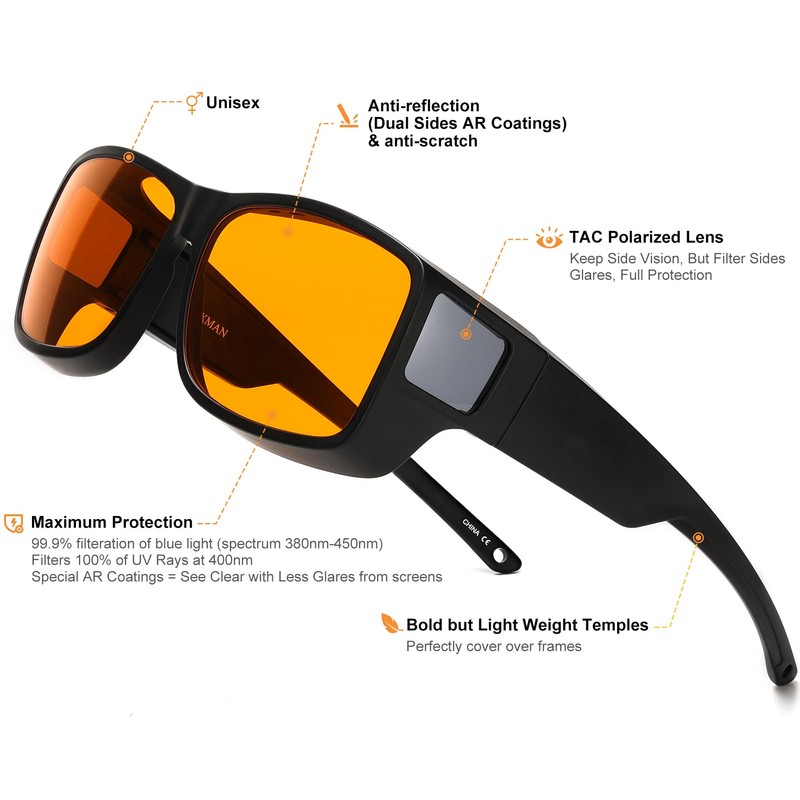 Professional sleep glasses to wear over your own frames to protect your eyes from blue light. Blue light is the key factor that causes sleep disorder. These 99.9% orange tinted blue light glasses can filter almost all blue light to help you sleep fast and better. To achieve a better result, you need to wear the orange lens blue light glasses at least 2 hours before bedtime can bring you a deep night sleep and wake up more refreshed