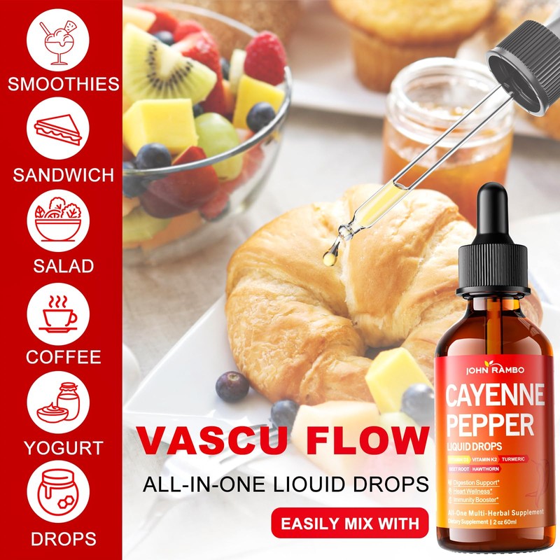 • ALL-IN-ONE Vascu Flow CAYENNE PEPPER LIQUID DROPS: Boost your wellness with cayenne pepper drops that provide a potent blend of organic cayenne pepper, hawthorn berry, beetroot, and turmeric. This all-in-one supplement combines the power of cayenne pepper extract, vitamins K2 and D3, and other botanicals to support your overall health. Whether you're looking to improve circulation, boost your metabolism, or enhance daily vitality, this liquid formula offers a simple way.