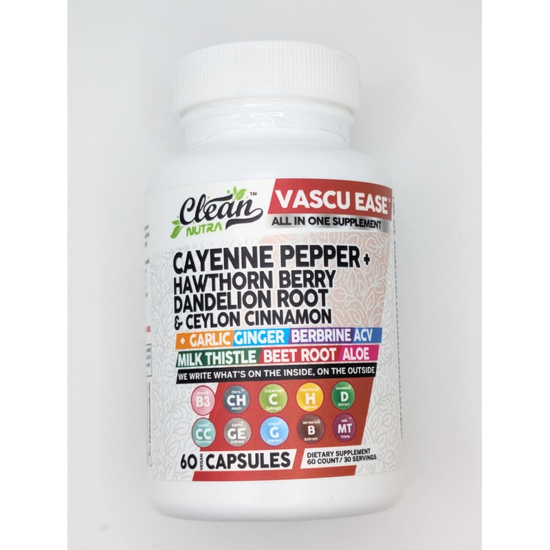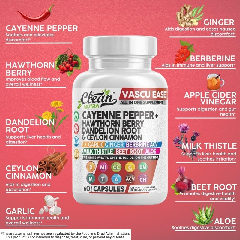 - All in one Supplement Cayenne Pepper Capsules : Clean Nutra's Vascu Ease is a powerful blend of time-tested herbs like ceylon cinnamon capsules hawthorn berry capsules, dandelion extract, garlic supplement, ground ginger, berberine supplement, acv capsules, milk thistle 1000mg, beetroot, and aloe vera. These vegan capsules deliver a potent dose that supports healthy digestion & immune health for balance. Together, these ingredients contribute to a feeling of overall wellness.