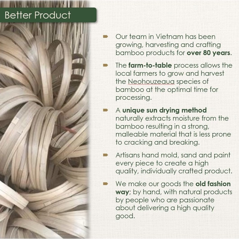 - Hand crafted in Vietnam by generational bamboo farmers and proud craftsmen for over 80 years. One of a kind, farm-to-table products which are made from sustainable, naturally sundried bamboo which is hand painted and meticulously finished to deliver an artful masterpiece.