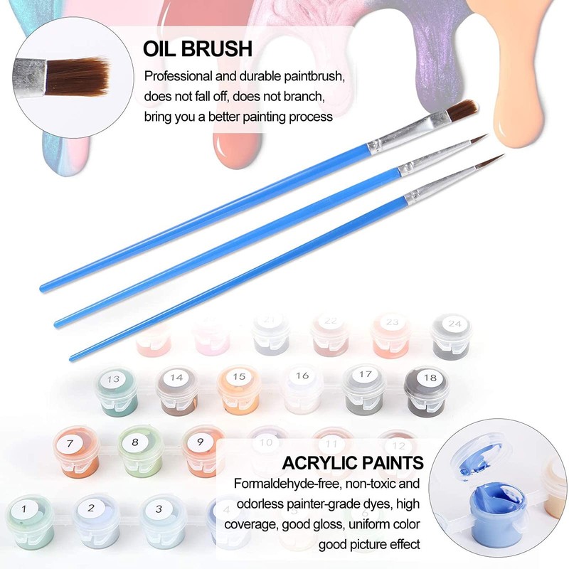 - Complete painting set: the DIY acrylic paints by numbers for adults are equipped with a complete tool set. The complete set includes 3 high-quality brushes, matching acrylic paints, nail hooks and screws for the frame and an instruction manual (English language not guaranteed). English language not guaranteed). Open the package and you can enjoy the fun of painting by numbers.