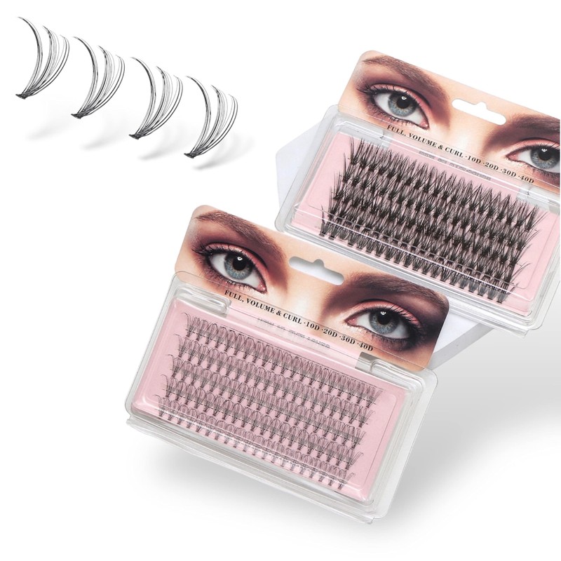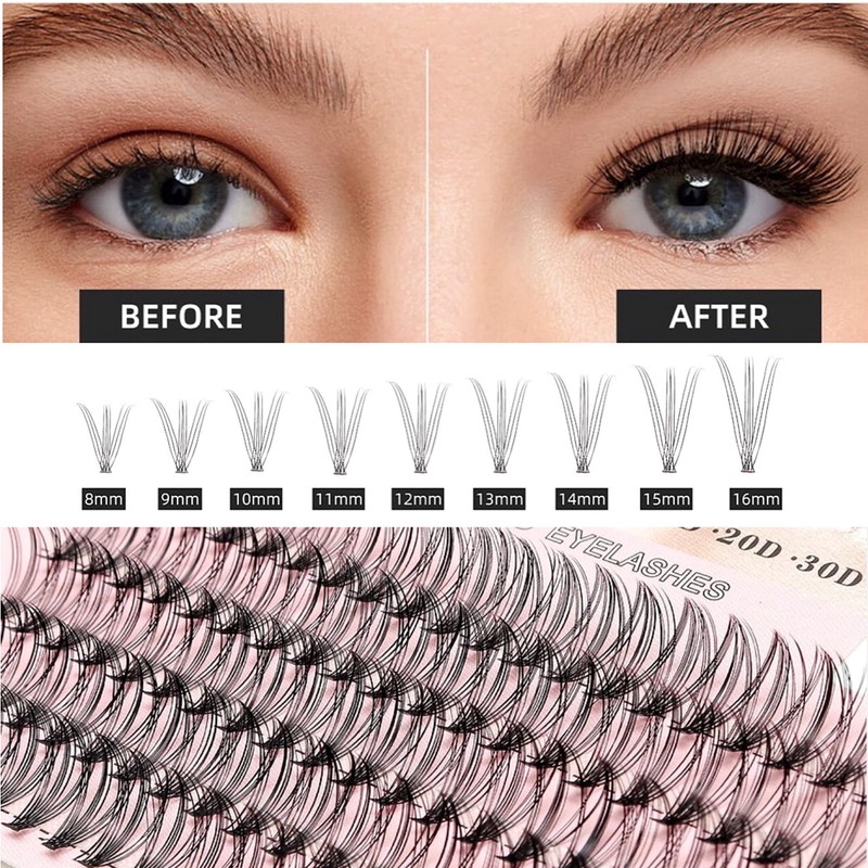 - Style: Natural Look Cluster Eyelashes. Color: Matte Black. Thickness: 0.07mm, Curl: D, Length: Choose From 10mm To 16mm, 20P, 30P, 40P.