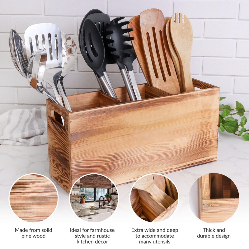 CB Accessories Utensil Holder in Rustic Wood for Farmhouse Kitchen Decor, Countertop Organizer and Cooking Tools Storage (Triple)
