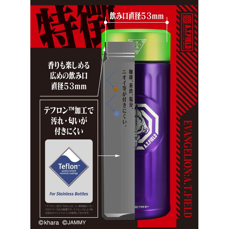 • Main Materials: Inner Bottle: Stainless steel (fluorine resin coating); Body: Stainless steel (acrylic resin coating); Lid: Stainless steel (outer surface): Stainless steel (acrylic resin coating); Lid (interior): Polypropylene, (mouth) Polypropylene, (gasket) Silicone rubber.