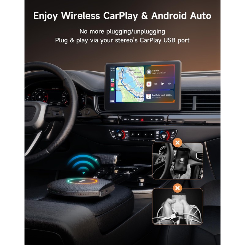 - Wireless Convenience: Transform your CarPlay or Android Auto from wired to fully wireless. Enjoy seamless phone integration on factory or aftermarket head units—no more cluttered cables