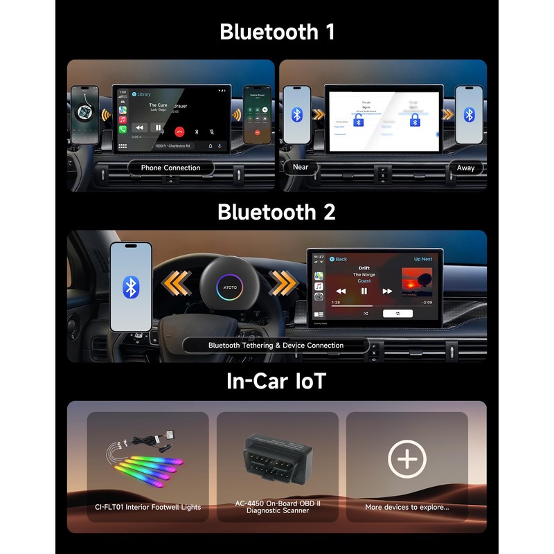 - Expanding Bluetooth IoT: Soon pair up to 10 Bluetooth add-ons—OBD adapter (recommend AC-4450 On-Board OBD II Diagnostic Scanner), footwell lighting (recommend CI-FLT01 Interior Footwell Lights), windshield LED signs, and more