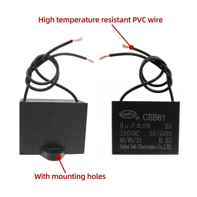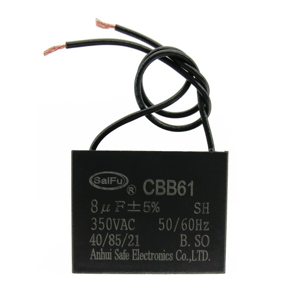 - ✅PERFECT FIT: The CBB61 8uf 2-Wire 250V/300V/350V Ceiling Fan Capacitor is widely used for ceiling fan, wall fan, stand fan, industrial fan, range hood fan, air exchange fan, water pump, motor, generator, etc. It is commonly used for Harbor Breeze & New Tech.