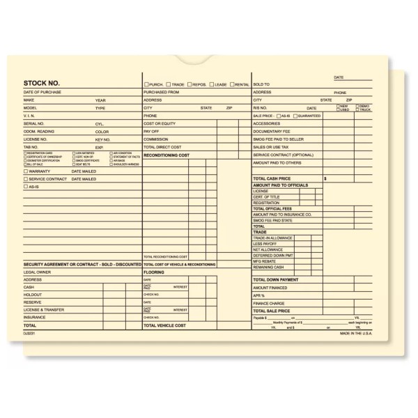 - The 3-in-1 deal jackets are printed with a design that is split into three columns. The first section provides the fields necessary to bring the vehicle into inventory, the second section details and itemizes the costs associated with reconditioning and trade-ins, while the third section records information pertaining to the sale of the vehicle.