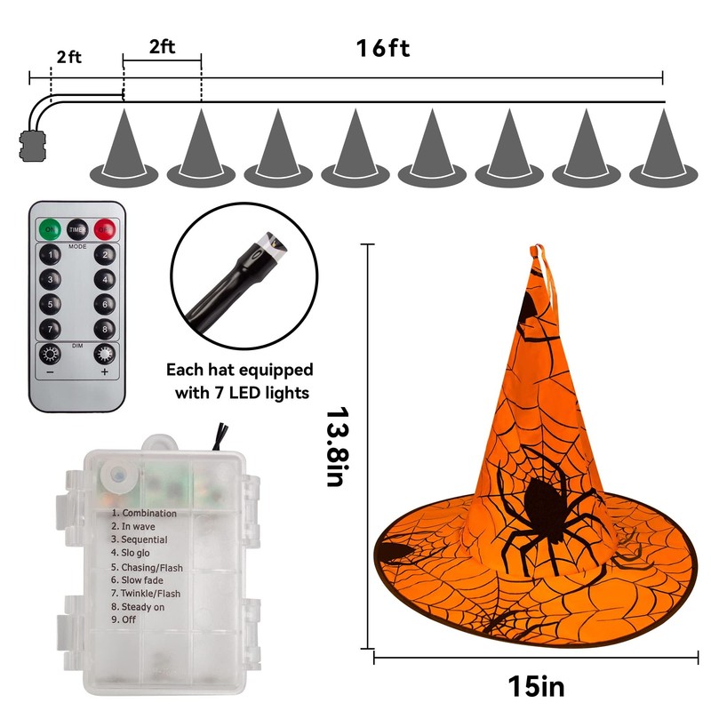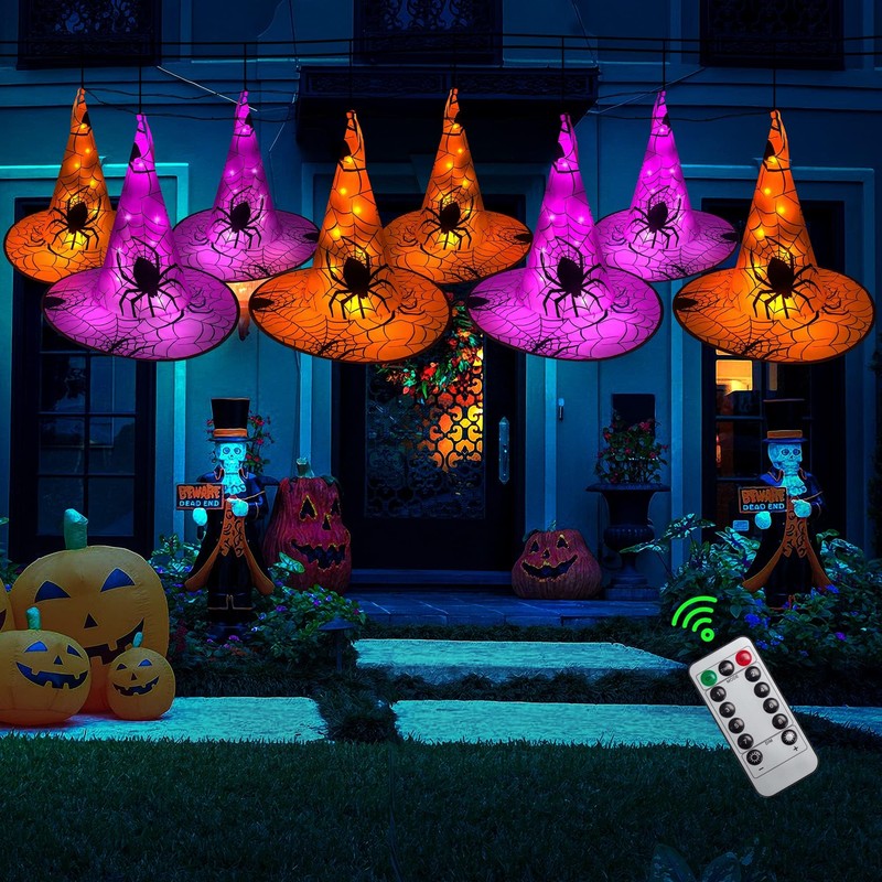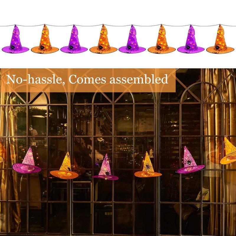 - PERFECT HALLOWEEN OUTDOOR DECORATION: The perfect combination of halloween witch hats with warm white string lights make you feel like you are in a mysterious castle of terror. There are 8 pcs witch hats (4 orange,4 purple)on string lights, each hat have 10 LEDs inside. Length: 14ft. Total length: 16ft.