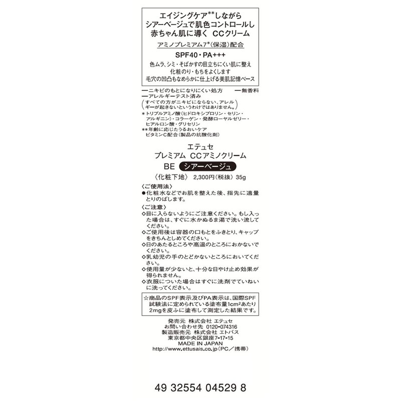 エテュセ プレミアム CCアミノクリーム BE(シアーベージュ) 化粧下地 毛穴カバー・色ムラ、赤みカバー・化粧崩れ防止 SPF40 PA+++ 35g