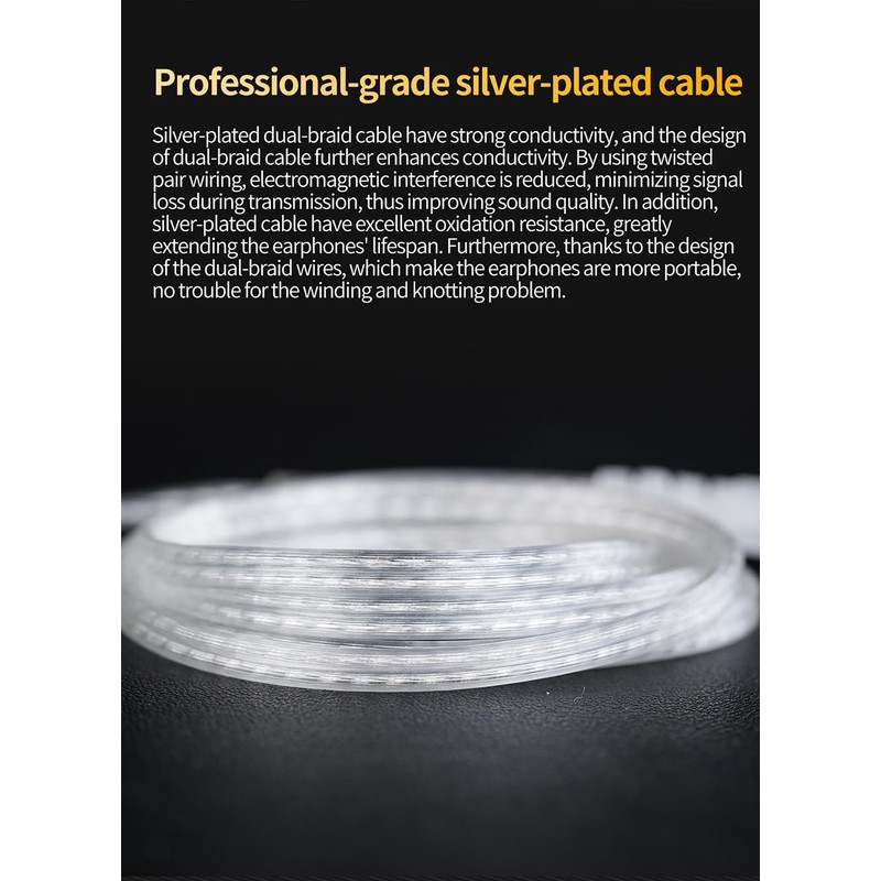 - 【Professional-grade Silver-plated Cable】Silver-plated dual-braid cable have strong conductivity, and the desigr of dual-braid cable further enhances conductivity. By using twisted pair wiring, electro magnetic interference is reduced, minimizing signal loss during transmission, thus improving sound quality. In addition, silver-plated cable have excellent oxidation resistance, the design ofthe dual-braid wires, which make the earphones are more portable no trouble for the winding and knotting problem, greatly extending the earphones' lifespan.