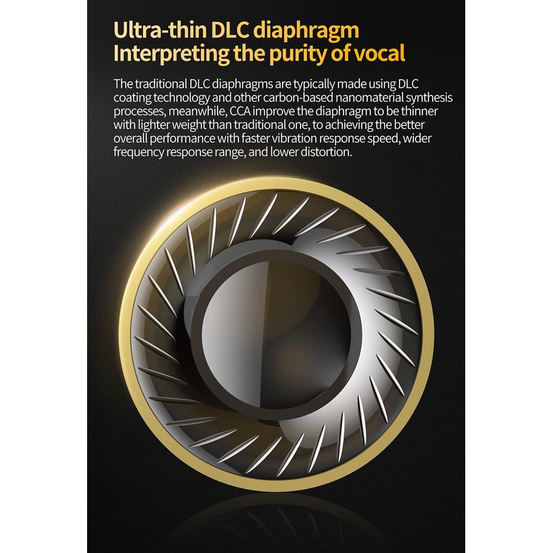 - 【New Era of Ultra-thin DLC Diaphragm Dynamic lEM】CCA improve the diaphragm to be thinner with lighterweight than traditional one. lts thickness is controlled at the micron level, ensuring rapid and precise response capability, show casing both high frequency extension and low-frequency depth with utmost clarity, offering superior rigidity and responsiveness, creating a lower distortion listening experience. Deep and powerful bass, rich and full midrange, clear treble, offering an unprecedented delicate auditory feast.