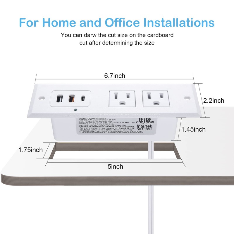 - Multifunctional hidden charging station for desktop, Desk hole cut size: L 4.9" * W 1.7", Need space under the table: 1.45inch. you can draw the cut size on the cardboard, cut after determining the size. Come with 10 ft flat plug extension cord.