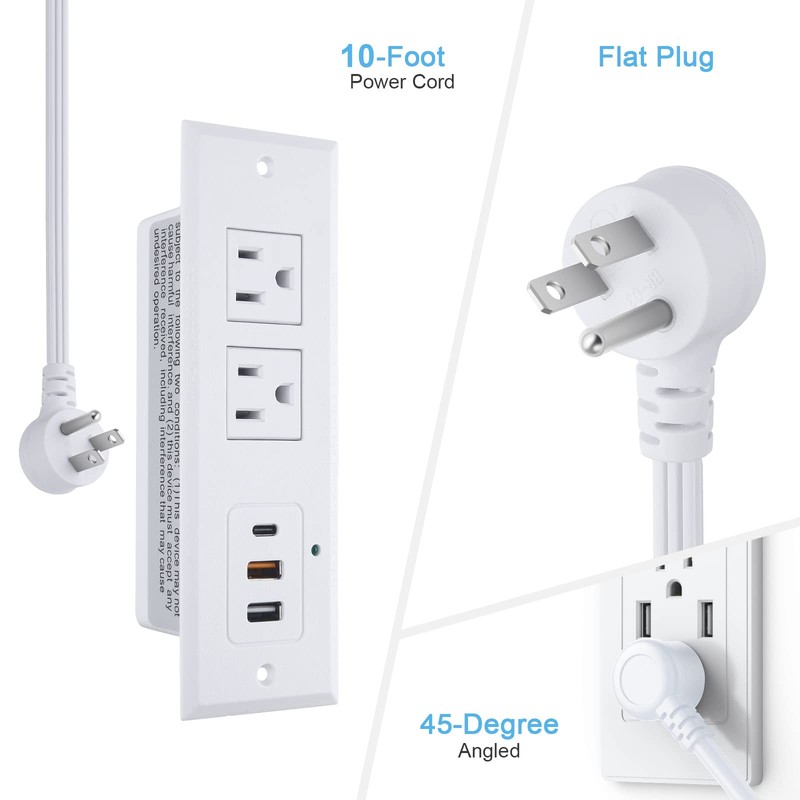 CCCEI Recessed Power Strip with 18W USB C Port, Fast Charging USB A Port Desk Outlet, Furniture Hidden Inset Socket with 6FT 45 Degree Flat Plug Extension Cord. 125V 12A 1500W. (10FT, White)