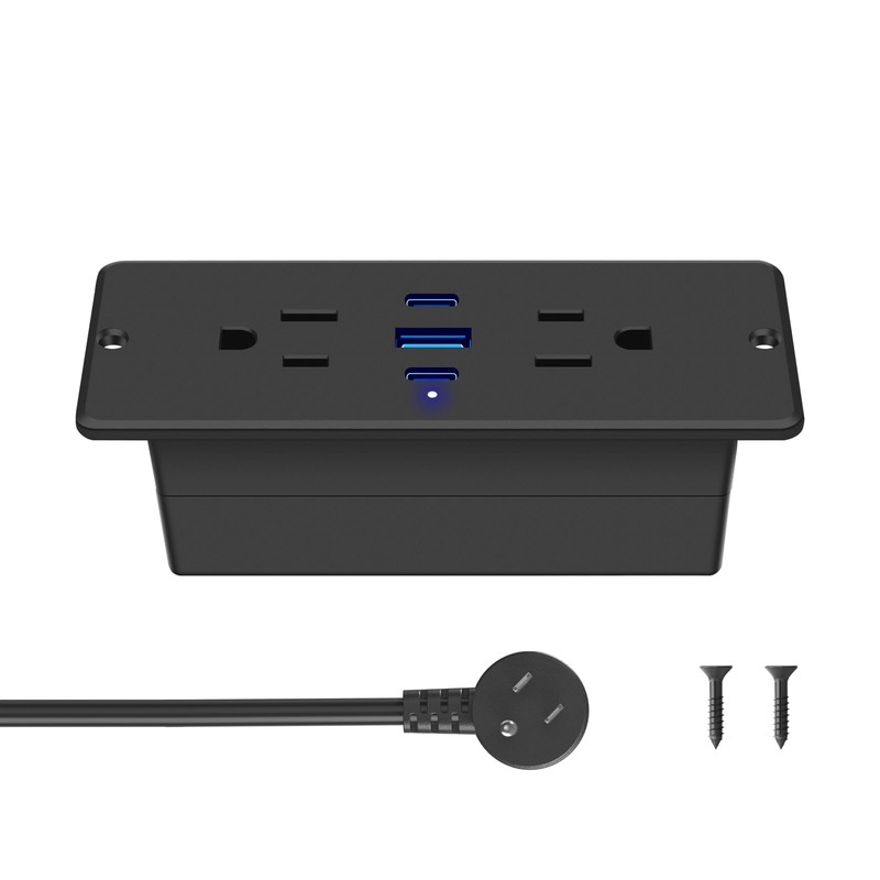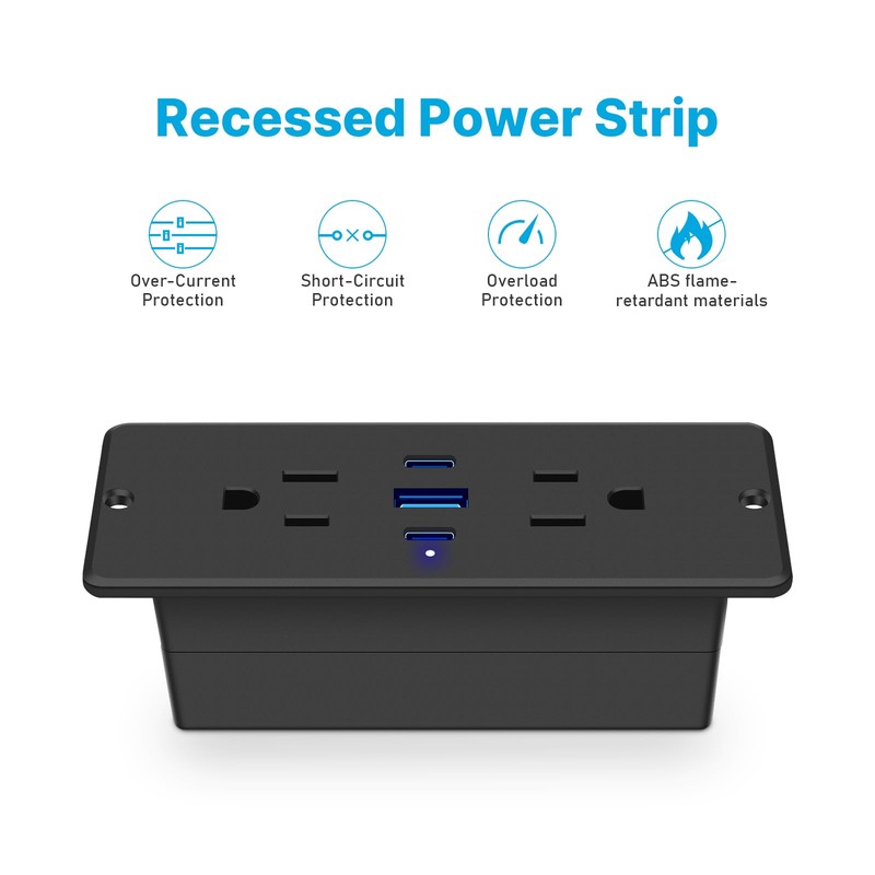 - Recessed power strip built in 2 outlets and 36W QC 3.0 USB A and 65W PD 3.0 USB C, and come with thin plug. Also reduces the number of power strips under your desk and helps manage cables.