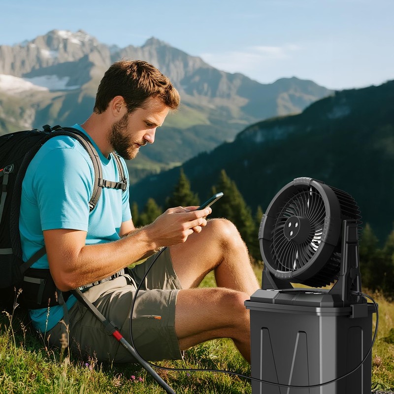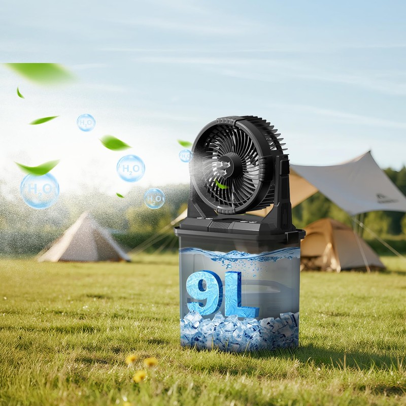 • 【9L Portable Water Bucket】 This rechargeable portable fan comes with a 9L water bucket, so you don't need to spend extra money to configure a water bottle, you can use it as soon as you get it. Large capacity design, it can be used for 5-9 hours after being filled with water, no need to add water frequently every few minutes! When not in use, the portable mist fan can be flipped over and stored in a bucket for easy storage, making it convenient to carry directly when traveling outdoors.