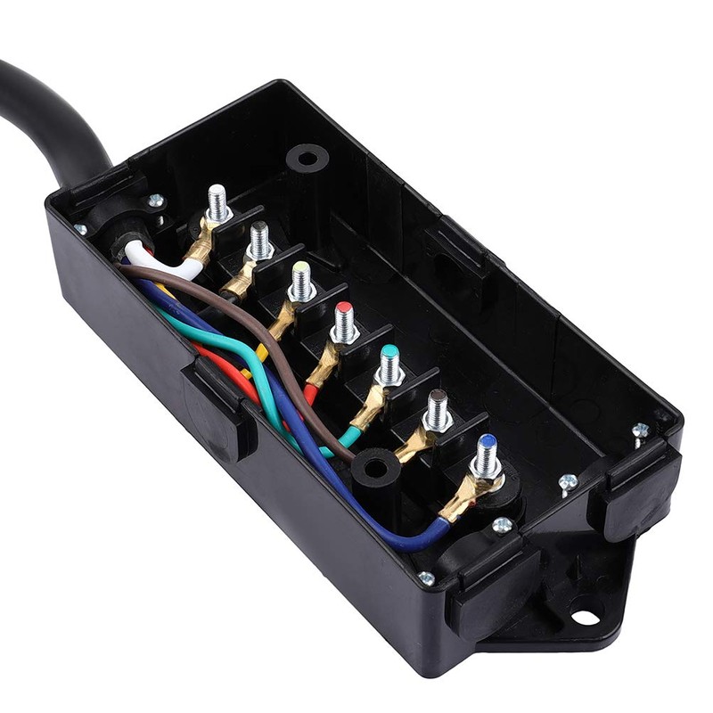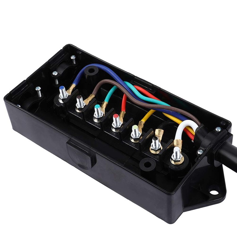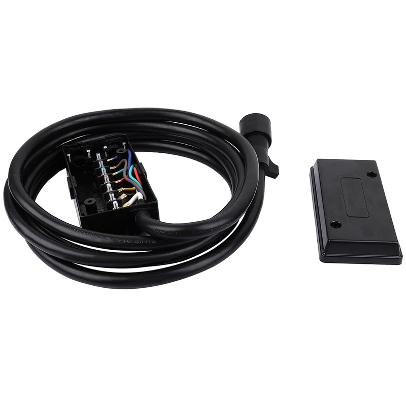 - Easily Identify the Correct Connection: Length: 12 FT. 7 Pole junction box is wired with color marked 7-poles that can be easily identified, Blue: 12AWG Electric Brakes; Brown: 14AWG Rigth Turn/Stop; Green: 14AWG Running/Tail Lights; Red: 14AWG Left Turn/Stop; Yellow: 14AWG Reverse Lights; Black: 10AWG 12(+)/Auxiliary; White: 10AWG Ground(-)
