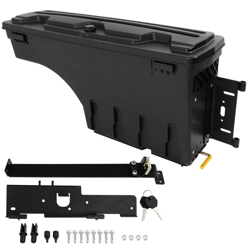 - Ultimate Accessibility | This toolbox swings out nearly 180° towards you for easy access from the tailgate & swings back into a locking position over the wheel well for maximum bed access.