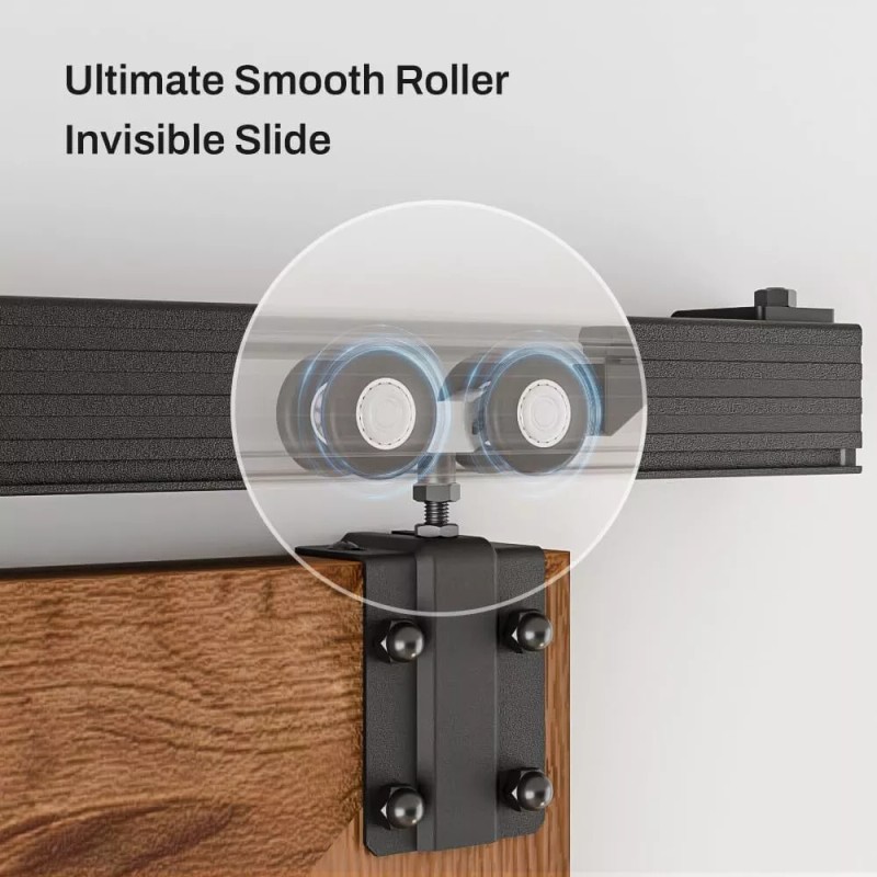 • 【Quiet and Practical】Super silently wheels which ensures rollers slide smoothly and quietly on the track, invisible sliding for overall aesthetics. The box rail barn door hardware fully cushioned at both ends to protect door and keep safety.