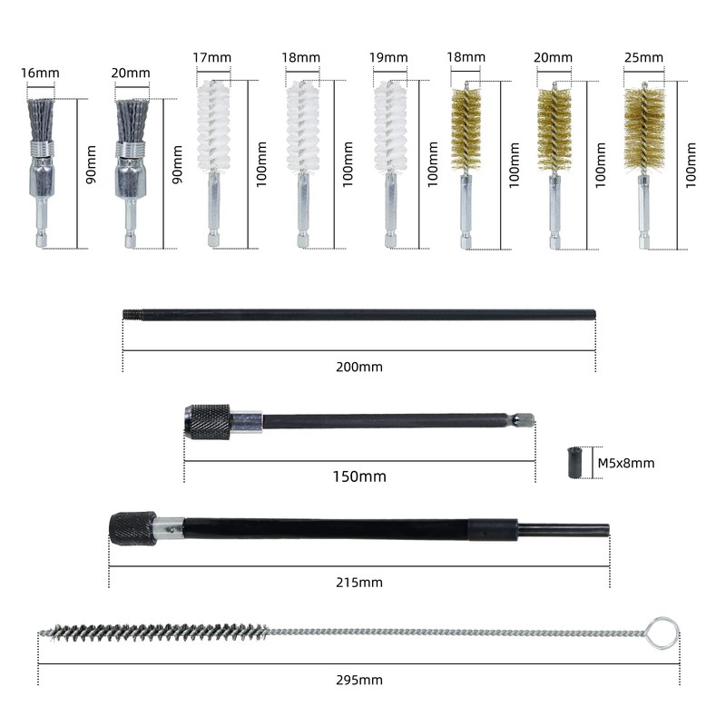 - Lieferumfang : 19tlg: 6?Injektorschacht, 3?Stahldrahtb1rsten, 3?Nylonb1rsten, 2?Silikon-Nylonb1rsten, 1?Verl?ngerung (Stahl), 1?Verl?ngerung (Felxible), 1?Handschrauber Bithalter Sechskant, 1 ? Montage-, Demontage-Stab, 1 ? Stahldrahtb1rste.