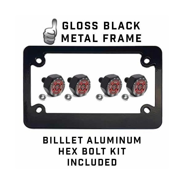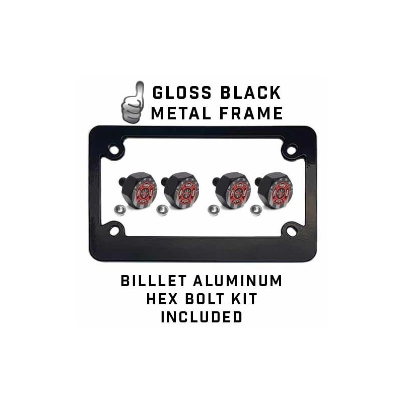 CCP Custom Parts Black Metal License Plate Frame & Hex Tag Bolt Kit - FIRE FIGHTER USA FLAG CROSS