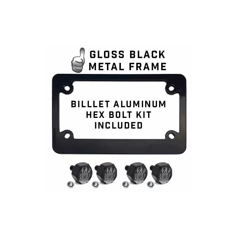 CCP Custom Parts Black Metal License Plate Frame & Hex Tag Bolt Kit - GREY HOT ROD FLAMES