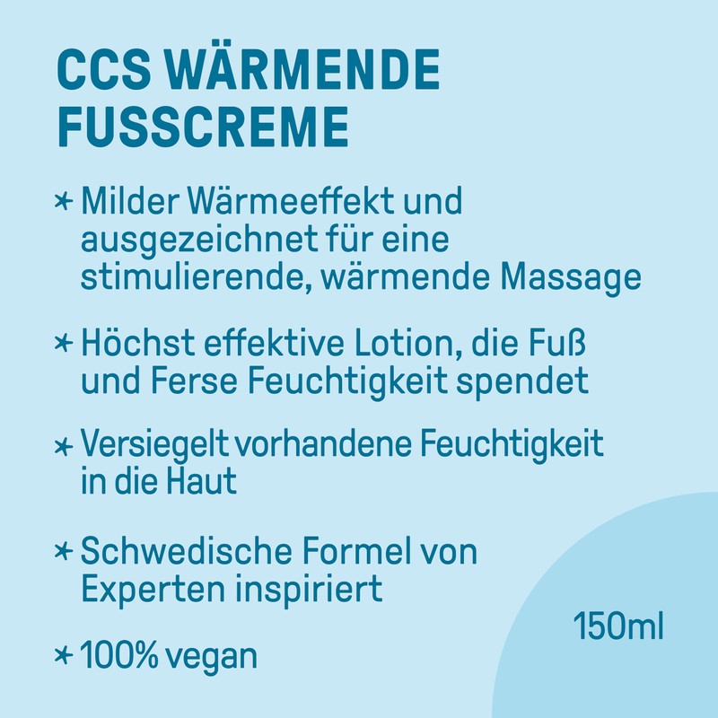 - Professional formula makes dry feet smooth and provides a warming feeling - CCS warming foot cream has been specially developed to pamper dry feet with a gentle warming feeling. Recommended by podiatrists.