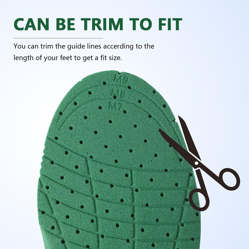 - [Compatibility] Memory foam shoe insoles come in a universal size design. In the back of the cushion insole have two cut lines, which can be cut according to your shoes and boots sizes. Comfort and cushioning for all types of leisure or daily footwear