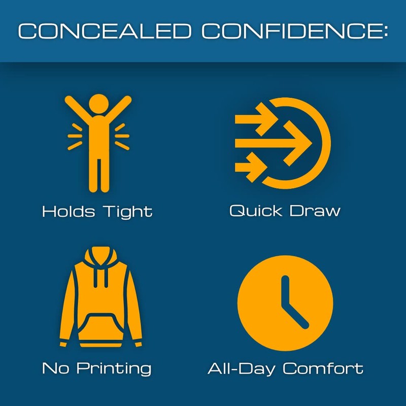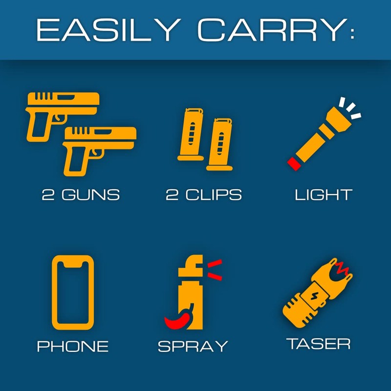 - EXCELLENT CONCEALMENT - NO PRINTING - Integrated holsters provide comfortable support for your gun, holding it snugly to your body. Comfortably carry spare clips, phone, small electronics, pepper spray, LVAD or other personal gear for use in sports, undercover, police, military, combat, assault, and covert applications! Sleeveless tank top shirt style LOOKS AND FEELS GREAT, indoors or out, under your button down shirt, t-shirt, pullover, or just about any clothing!