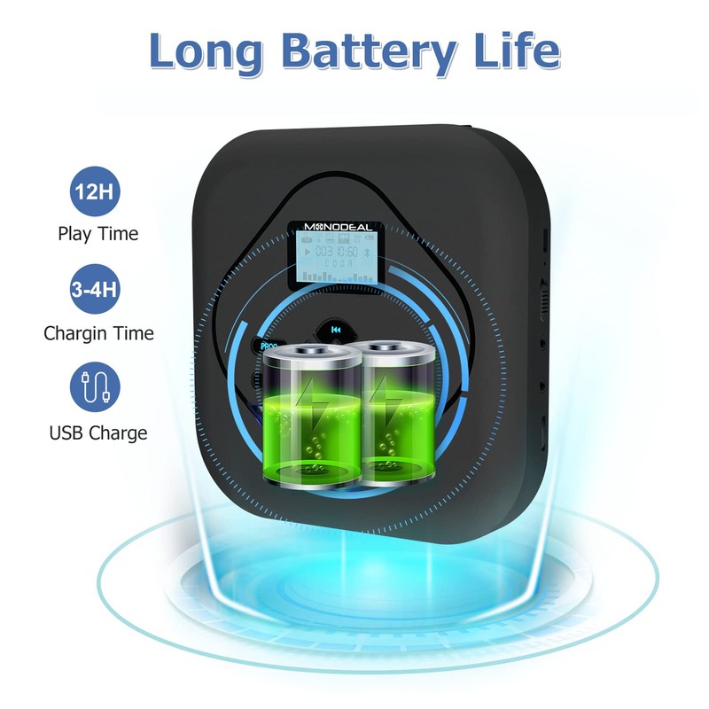- Rechargeable & Portable: This portable CD player has a built-in rechargeale battery. It gets fully charged in about 4 hours with the included USB-C charging cable and supports at least 10+ hours of playback. Also, the compact design is easy to carry.