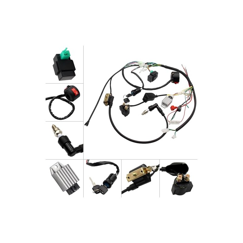 - Package Includes: 1 x ATV Wire harness +1x 5 Pin CDI + 1x Spark plug + 1x 2 Wire Ignition Coil + 1x Solenoid Relay + 1x Rectifier (Voltage Regulator) + 1x Multi-functional ATV Switch + 1x Ignition Key Switch (2 keys) + 5x Cable Ties + 1x Wiring diagram