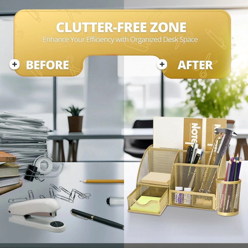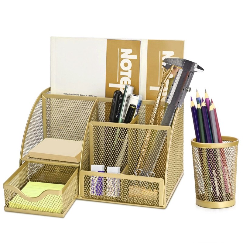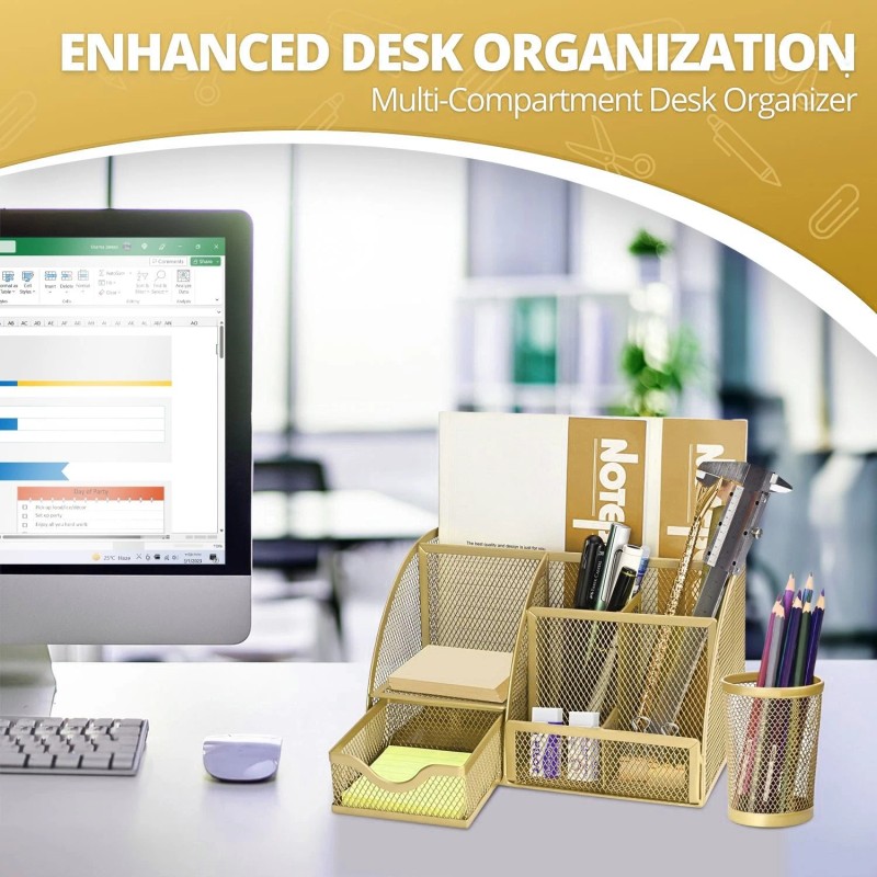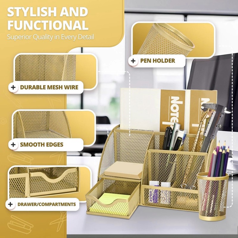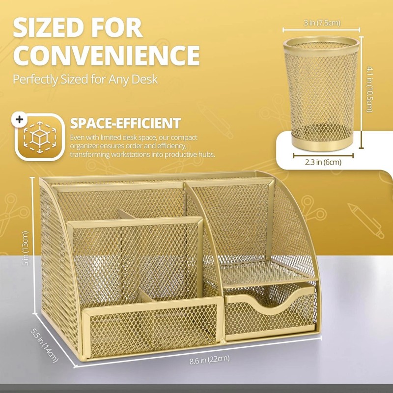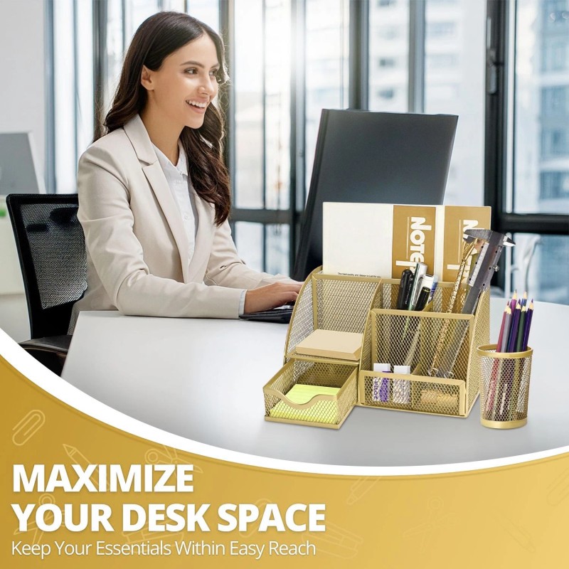 Desk Organizer Office Supplies Accessories Desktop Tabletop 6-Compartment Sorter Caddy Set - Metal Mesh with Drawer and Pen Holder Cup (Rose Gold)