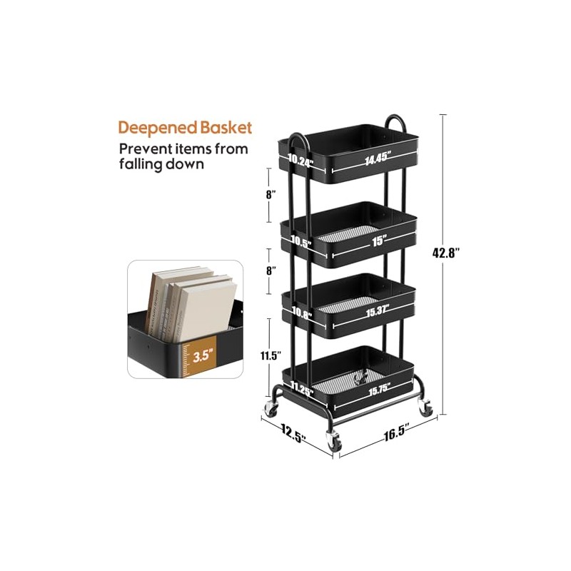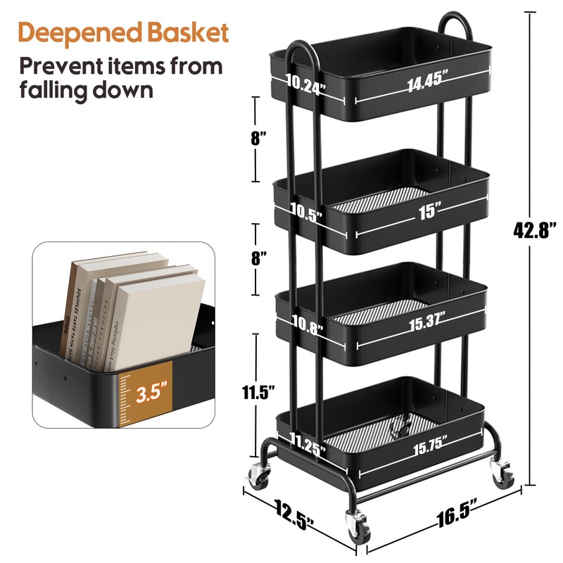 • Easy to Access: The basket of our rolling storage cart is 3.5’’ high, things will not fall when pushing the cart. And two tiers of 8-inch-high space makes it easy to put and take.