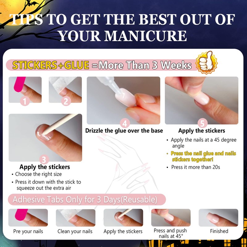 - Safe material: our shiny Halloween false nails are made of environmentally friendly, high-quality acrylic materials, are non-toxic, harmless and durable, thick enough not to tear or bend easily, the pattern print is clear and does not fade easily. We provide you with a jelly adhesive set that will not hurt your nails and give you a comfortable and safe experience.