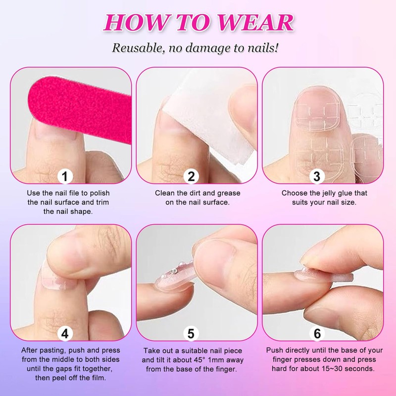 - Easy to use: With just a few simple steps - clean your nails, choose the right size, apply the nail glue stickers and press the trendy nails for 20 seconds to get the natural manicure that girls like. You can also shorten and file the nails into different lengths and shapes to suit your personal preferences, so you can easily create personalised nail designs.