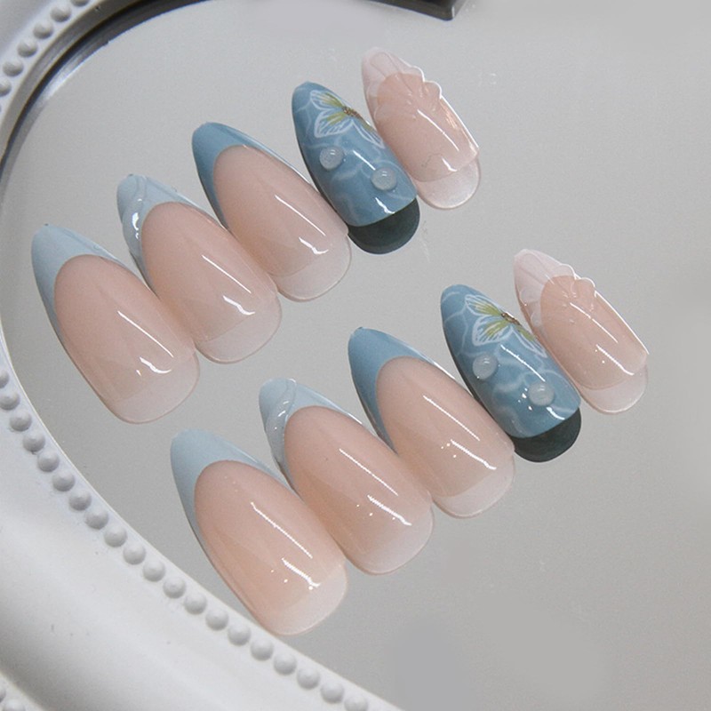 Ceboic Pack of 24 Blue French Stick-On Nails, Almond Medium Length Press On Nails Acrylic Artificial Nails, Ballerina Glossy Stick-on Fingernails for Women and Girls - Shells & Waves