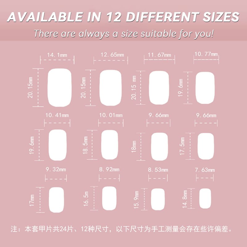 Various sizes: the package contains 24 false nails in 12 different sizes that fit each finger.