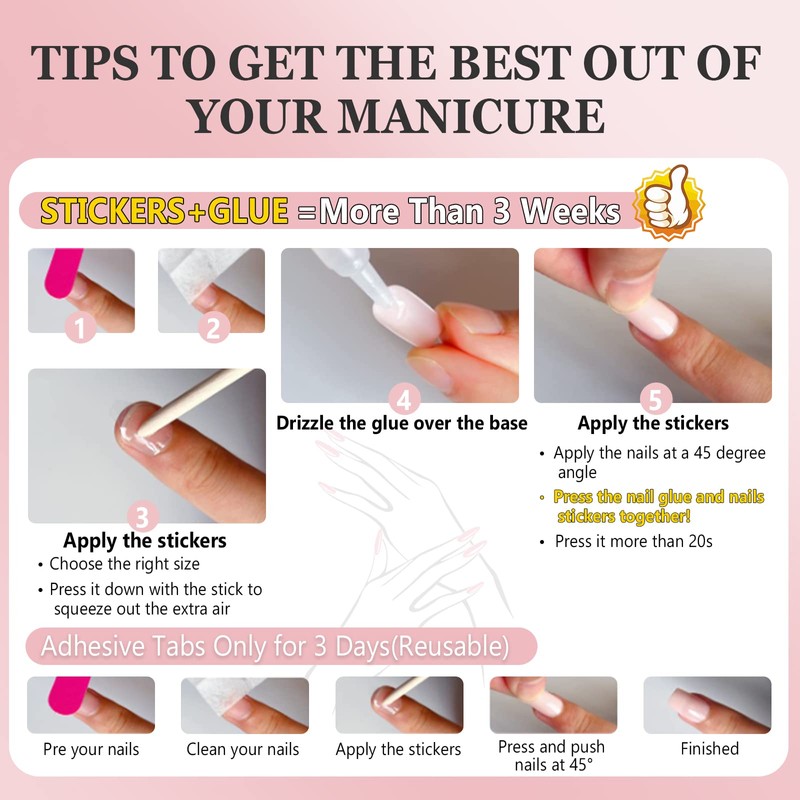 - Easy to use: simply clean your nails, then choose the right nail size, stick double-sided adhesive tabs on the nails and press for a while, in just a few simple steps you can have luxury salon nail art yourself. How amazing to save money and time! Due to the limited use of jelly glue, we recommend you use your own glue.