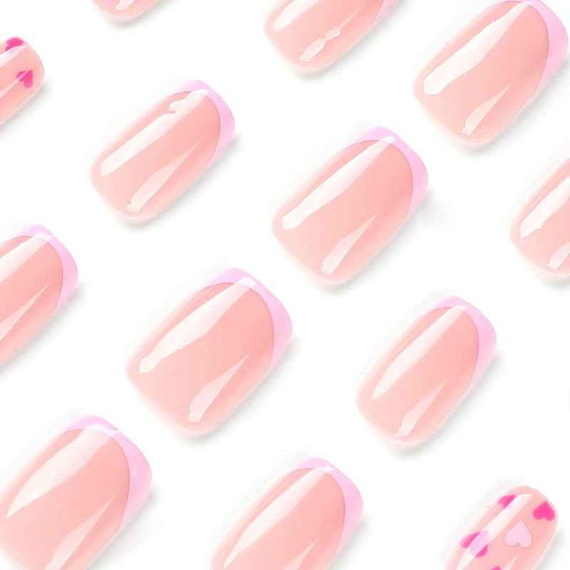 Ceboic Pack of 24 Glue-On Nails, Short Square, Glossy Nude French Artificial Nails, Press On Nails with Heart Designs, Red & Purple Acrylic Fingernails, Artificial Nails for Women and Girls