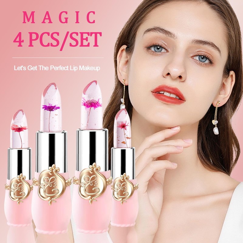 Ceboic Set of 4 Crystal Flower Jelly Lipstick Set, Magic Temperature Colour Changing Lip Gloss Transparent Waterproof Lip Balm, Long-Lasting Moisturising Cream Jelly Lipstick for Mother Girls