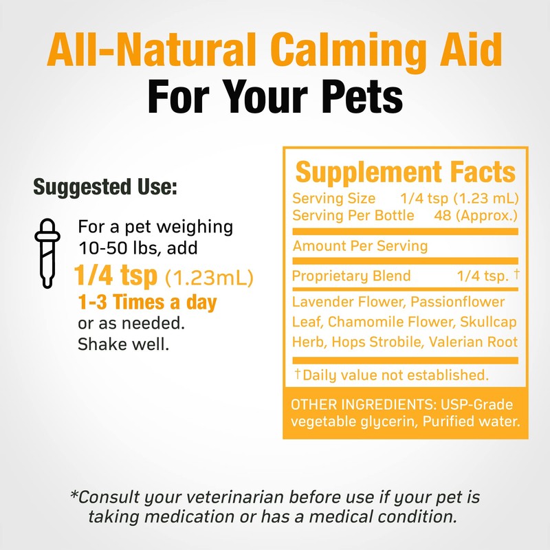 - All-Natural Calming Aid for Dogs and Cats- Our cat and dog supplements contain an all-natural blend of lavender flower, passionflower leaf, chamomile flower, skullcap herb, and other natural herbs. This alcohol-free dog and cat calming supplement has no preservatives or artificial colors and flavors.