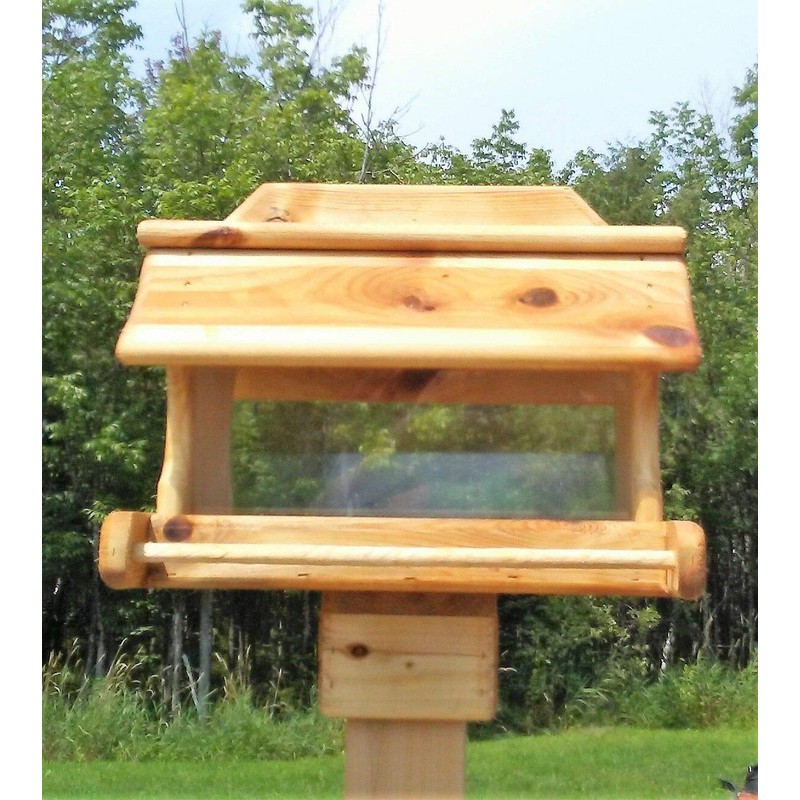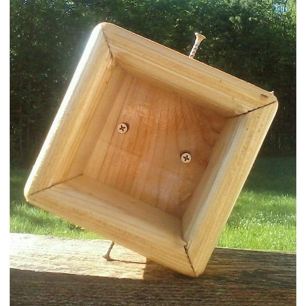 Attractive White Cedar Post mount for bird houses or bird feeders with 4 screws. 1. Made from 3/4 inch White cedar. 2. Will fit on a standard 4x4 post (3 1/2 inch by 3 1/2 inch) 3. Top is 5 1/4 inches x 5 1/4 inches 4. Base is 3 5/8 inches x 3 5/8 inches inside and 5 1/4 inches x 5 1/4 inches outside 3 inches tall. 5. Comes with 2 - 1 5/8 inch screws and 2 - 1 1/4 inch screws. 6. Bird feeder not included. This is designed for use on the medium and large feeders or bird houses.