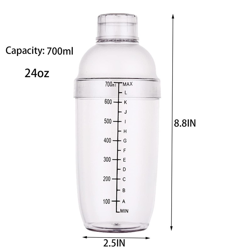 - Include 4 pack plastic cocktail shaker, Size: 2.5''x 8.8'' x 1.6'' (Bottom Dia x Height x Upper Dia), equal to 24oz(700ml). Lightweight, convenient to use. Easy to clean, dishwasher safe.