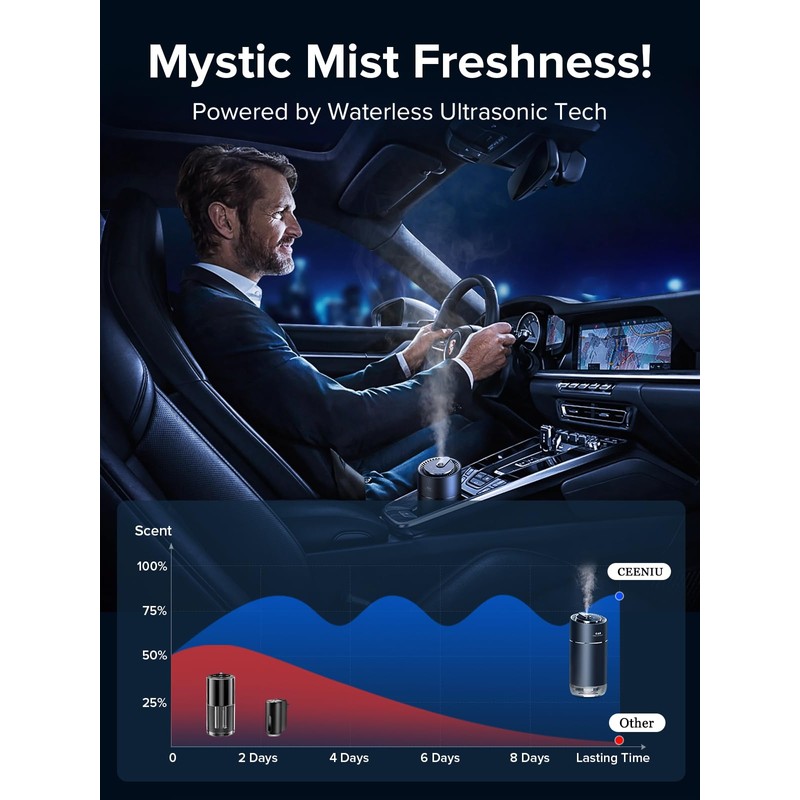 Ceeniu Smart Car Air Fresheners, New Car Smell Scent, New Experience by Ultrasonic Mist, Auto On/Off, Natural Fragrance Lasts for 4 Months, Adjustable, Built-in Battery Car freshener