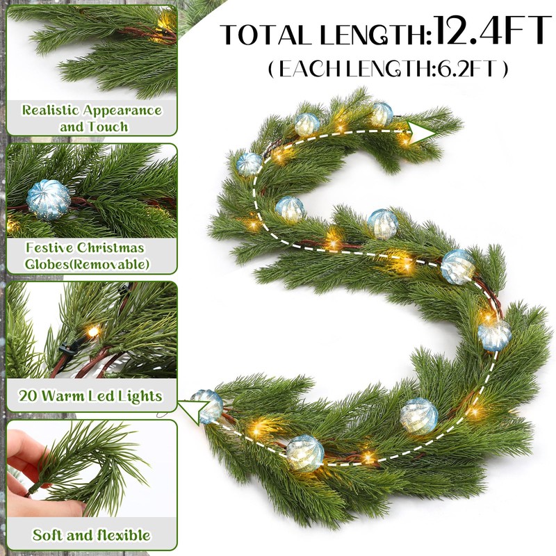 - Prelit Christmas Pine Garlands with Lights: you will get 2 pcs of prelit Christmas cedar garlands in a length of 6.2 ft/190 cm, each adorned with 20 LED lights, and 10 of them featuring removable Christmas balls; The combination of leaves and the garland enchanting glow makes it a fantastic decoration for a joyful and warm Christmas atmosphere